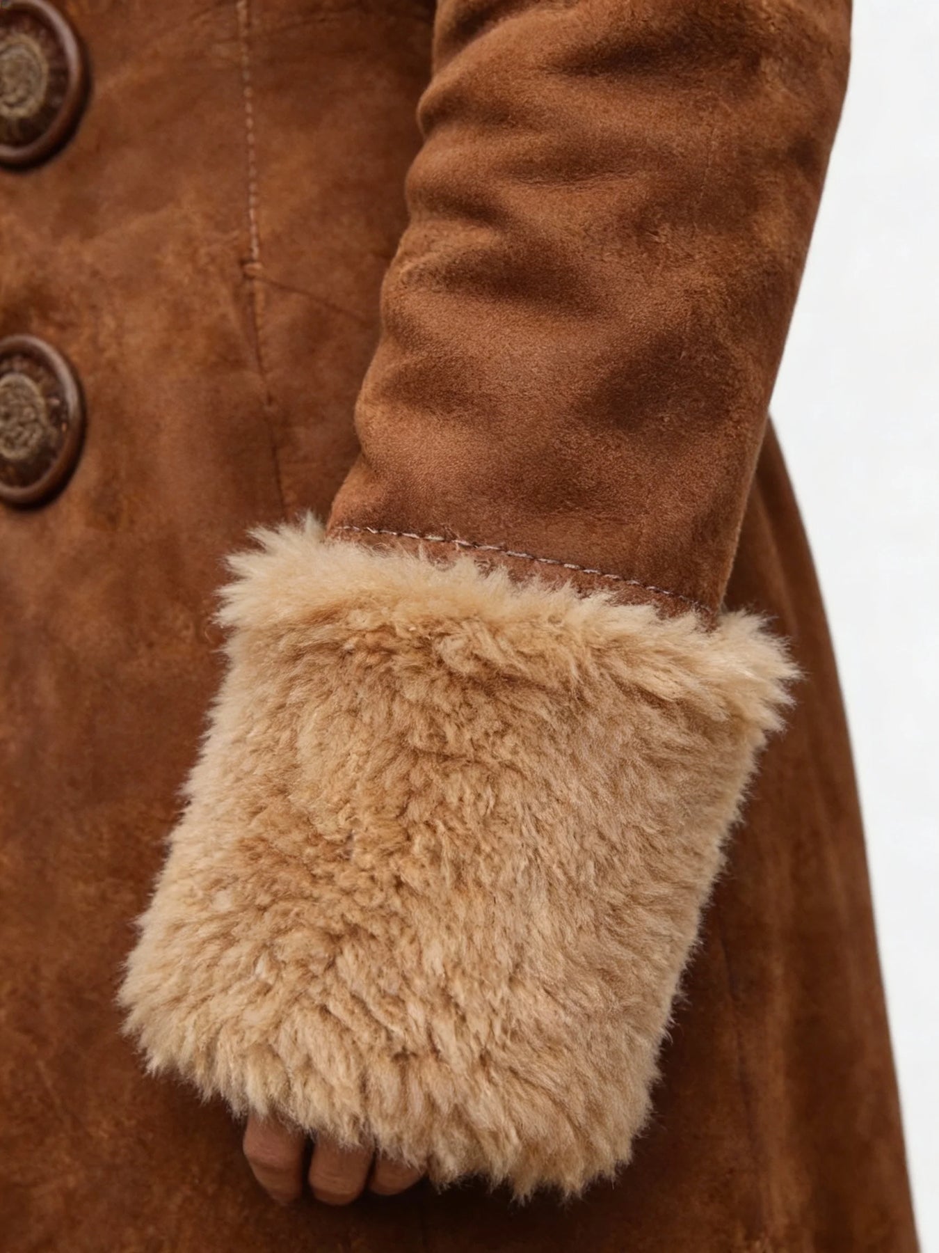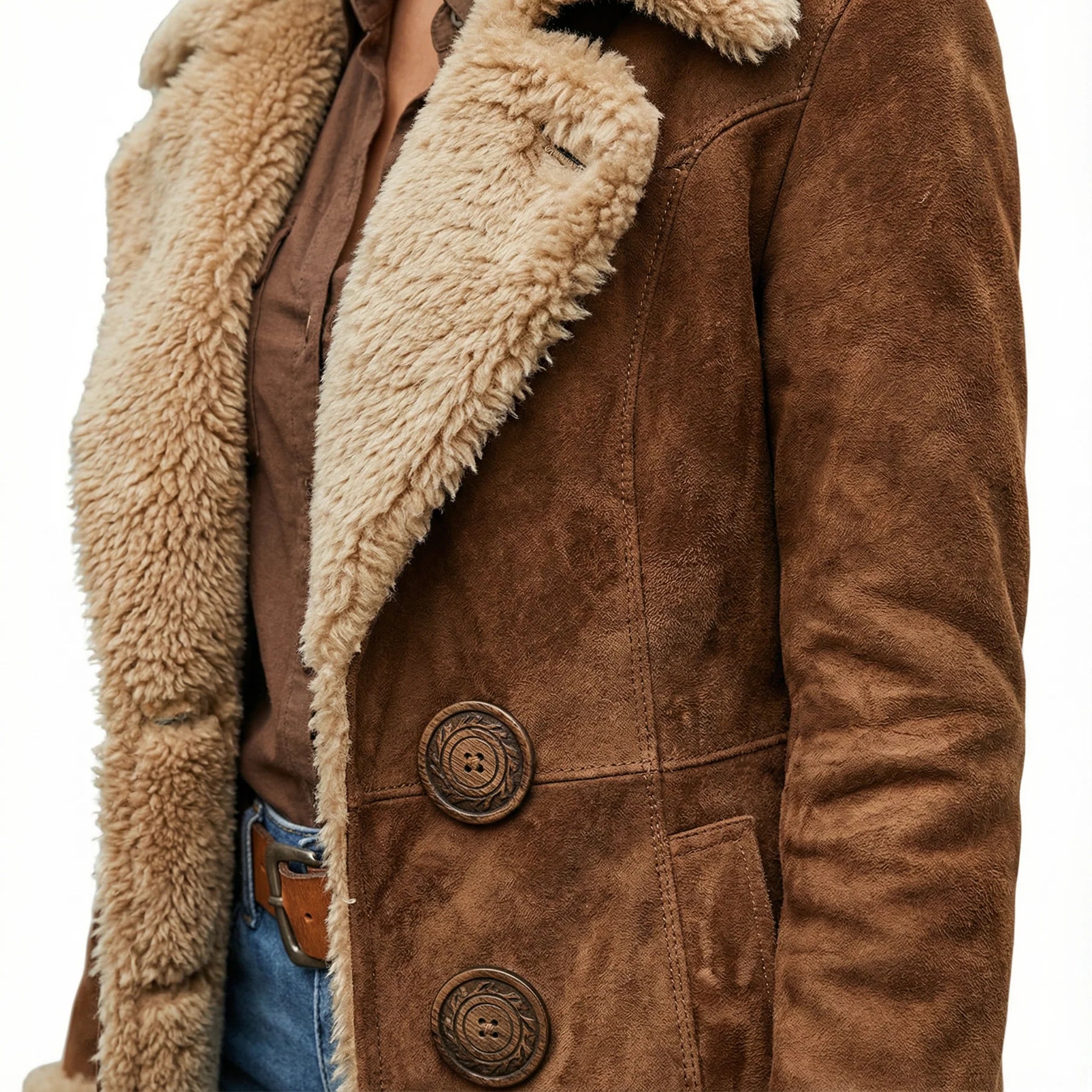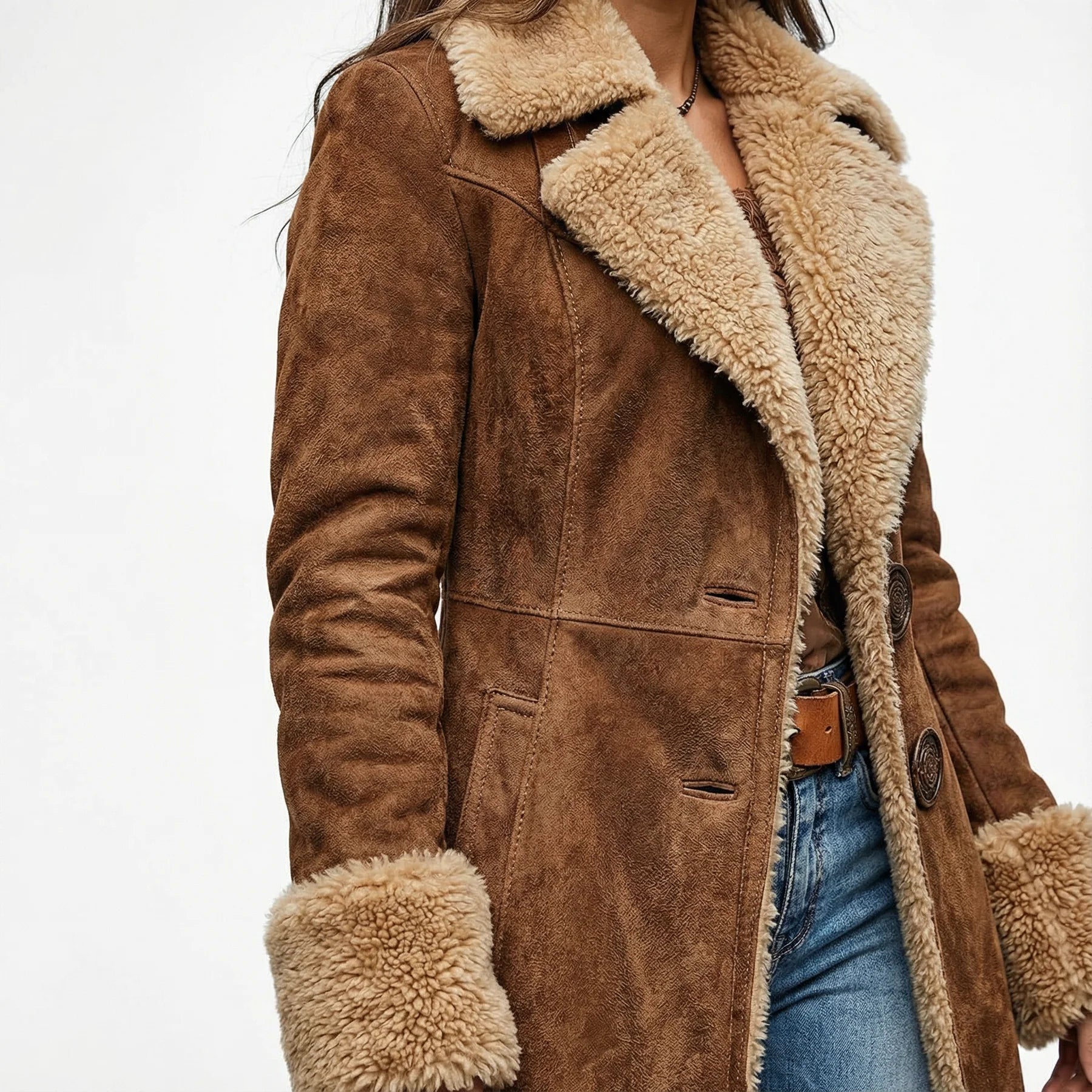 Ara is inspired by vintage silhouettes and designed for modern ease. The long, softly flared shape elongates the figure, while the suede-inspired exterior and plush faux fur lining create a refined balance between structure and softness.