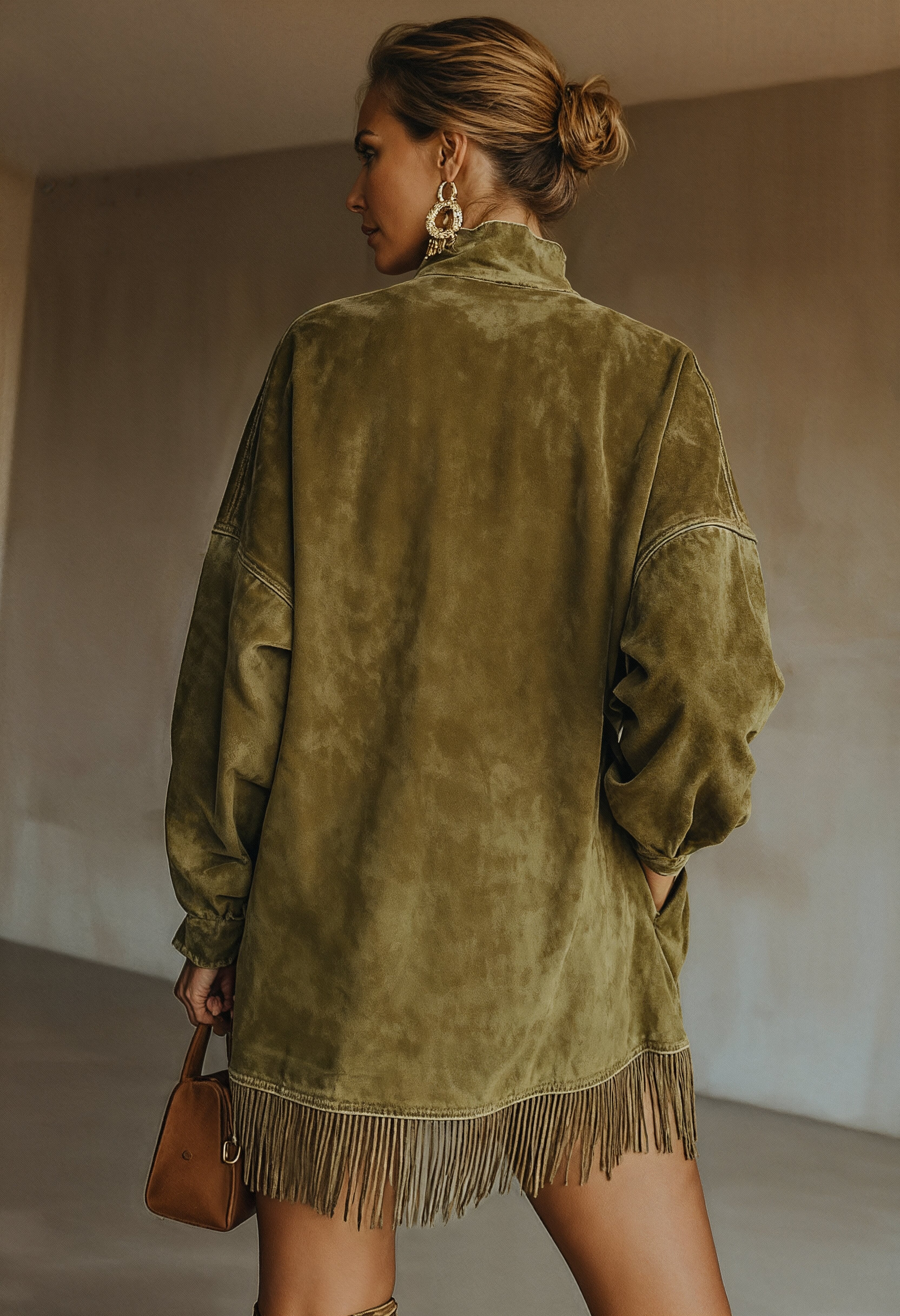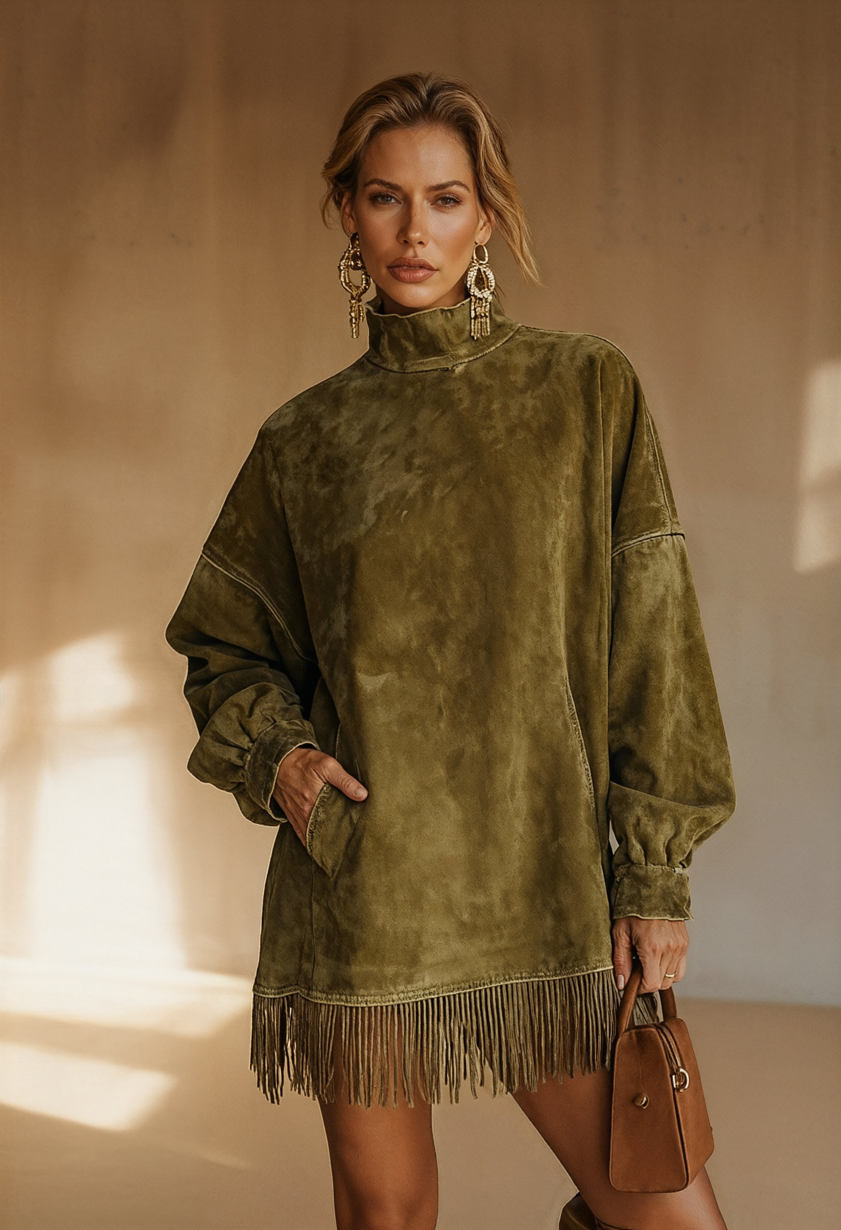 The Nathalie Dress blends understated sophistication with a touch of playful Western charm. Crafted with a smooth, suede-inspired texture, it drapes beautifully over the body, offering a relaxed, flattering fit that feels as good as it looks. The chic fringe hem adds gentle movement and personality, turning even the simplest outfit into something memorable.